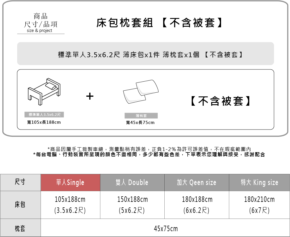 內含物 : 單人薄床包*1件+歐式薄枕套*1件 尺 寸 : 標準單人薄床包3.5*6.2尺(105cm*188cm) 歐式薄枕套X1件 (45cm*75cm) 材 質 : 300織天絲™萊賽爾 TENCEL™Lyocell