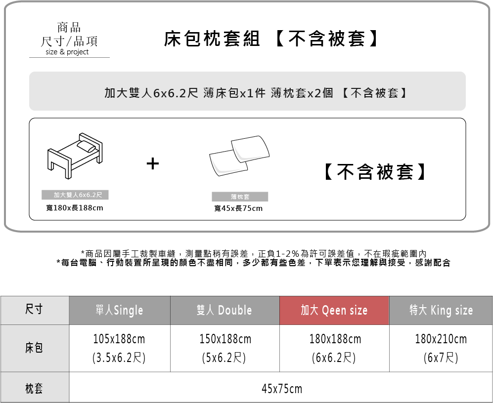 尺 寸 : 加大薄床包6*6.2尺(180cm*188cm)