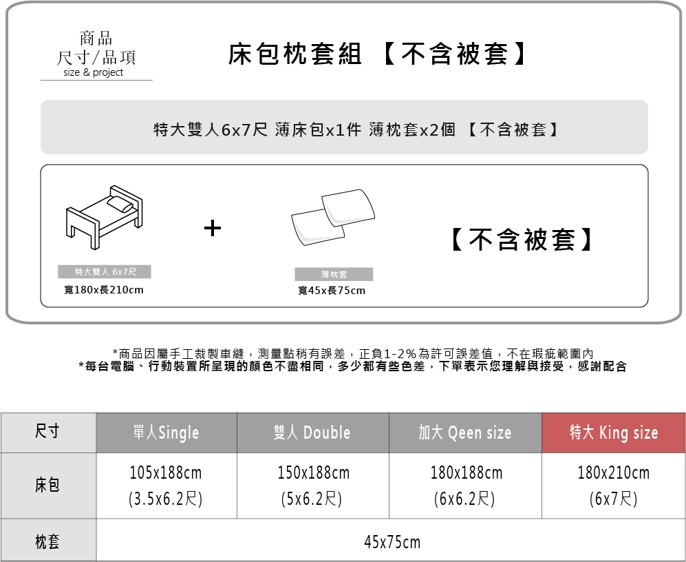 內含物 : 特大薄床包*1件+歐式薄枕套*2件 尺 寸 : 特大薄床包6*7尺X1件(180cm*210cm) 歐式薄枕套X2件 (45cm*75cm) 材 質 : 300織天絲™萊賽爾 TENCEL™Lyocell