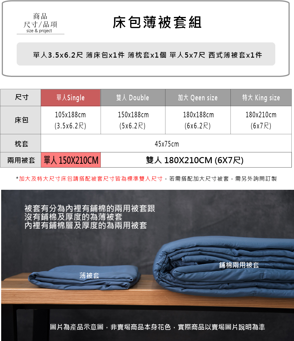 內含物 : 標準單人薄床包*1件+歐式薄枕套*2件 +標準單人薄被套*1件尺 寸 : 標準單人薄床包3.5*6.2尺(105cm*188cm) 歐式薄枕套X1件 (45cm*75cm) 標準單人薄被套5*7尺(150m*210cm)材 質 : 100%300織天絲™萊賽爾