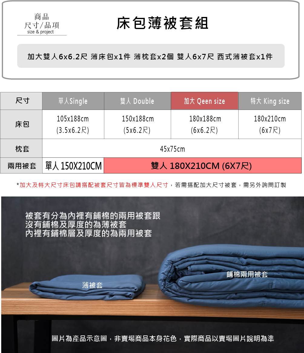 內含物 : 加大薄床包*1件+歐式薄枕套*2件 +標準雙人薄被套*1件