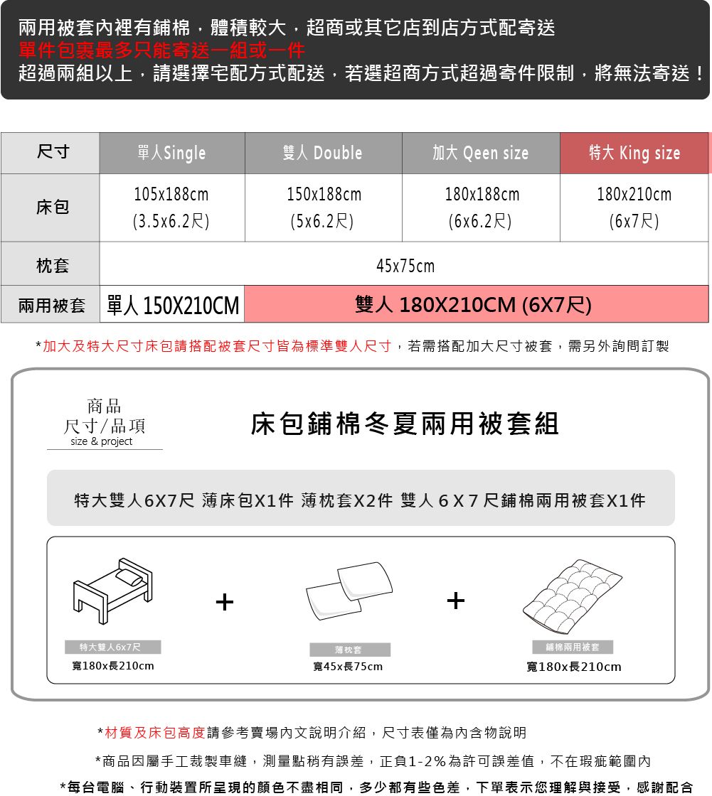 內含物 : 特大薄床包*1件+歐式薄枕套*2件 +標準雙人兩用被套*1件尺 寸 : 特大薄床包6*7尺(180cm*210cm) 歐式薄枕套X2件 (45cm*75cm) 標準雙人兩用被套6*7尺(180m*210cm)材 質 : 100%300織天絲™萊賽爾